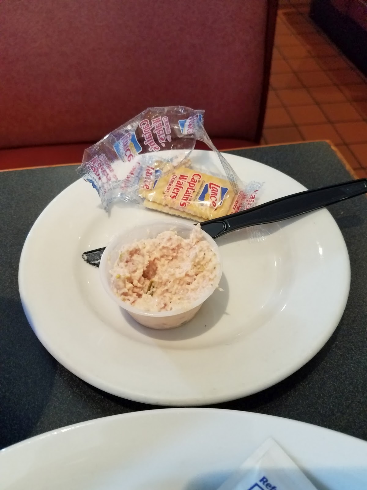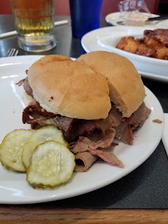 This is a sit down restaurant. I walked in and was greeted instantly by a waitress who said I could sit wherever I wanted. Once I found a table, she quickly came over and gave me a menu. I noticed that they have smoked chicken wings, so I decided to try those along with the 1/2 pound brisket sandwich. The waitress offered me a free smoked ham salad appetizer with crackers. It was pretty good. There is a picture below.