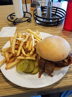 I visited the restaurant a little after 5:00 on a Thursday. At Jon Russell’s you order your food at the counter and then find a table and they bring your food to you. I ordered the smoked brisket that they call the “Super B” with fries. The price was $9.64. They brought the food out in about 10 minutes. The fries were hot right out of the fryer and had a flavorful seasoning on them. The brisket is served on a bun with a little bit of their sauce on it. The meat was hot and tender but a bit bland tasting and chewy. Overall a good, but not great, sandwich. I tried two of their sauces with the fries. They have a “smoking ghost” sauce that was much more sweet than spicy and a “regular” sauce that is ok, but nothing to write home about. They also have a drink station for free pop and water refills and they have a self serve sauce station.