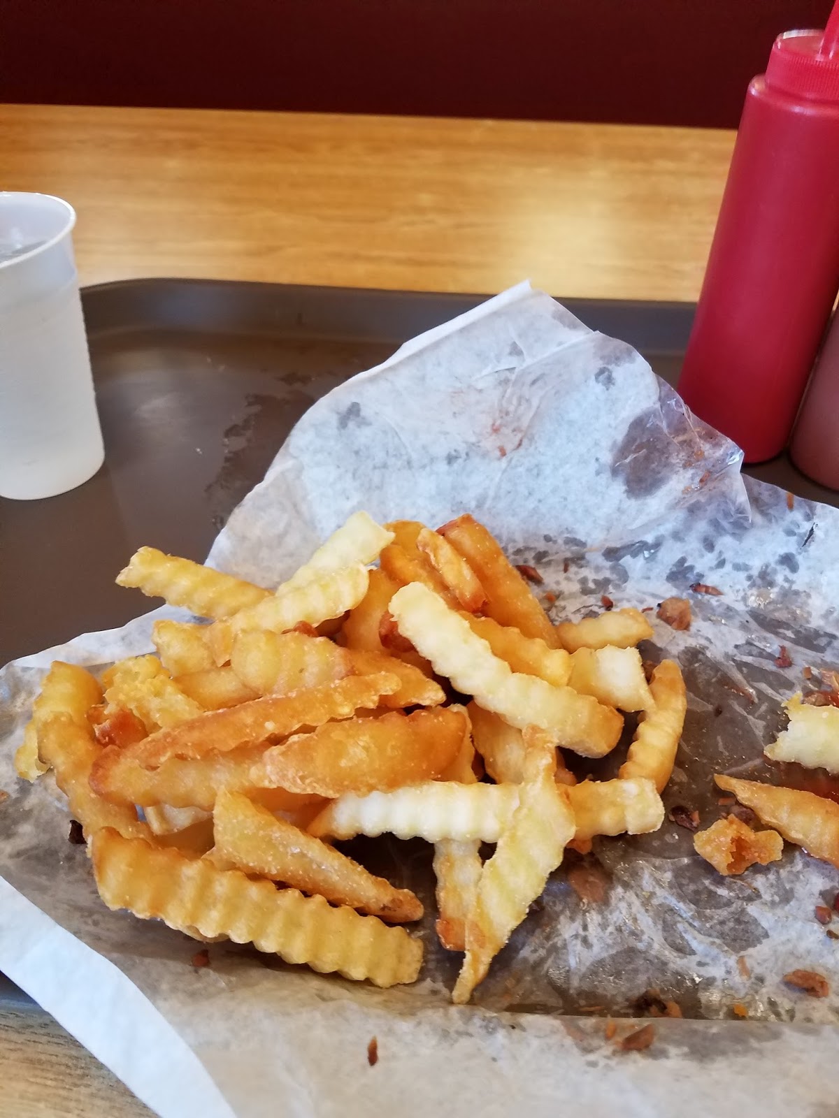 The fries were hot but they had no seasoning on them. I ate them with barbecue sauce. They provided ketchup and barbecue sauce on your serving tray.