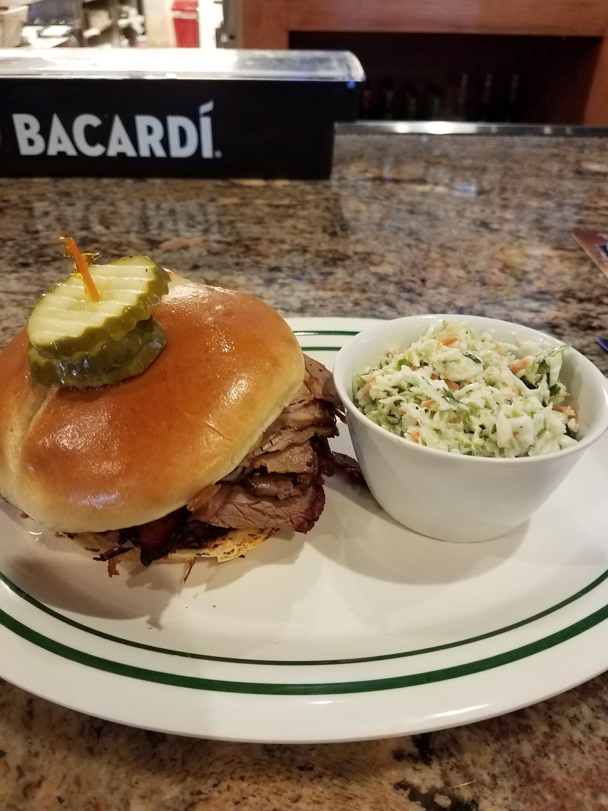I ordered the brisket sandwich with coleslaw. By the time they brought my dinner roll my sandwich was being served. It took less than two minutes to get my food. The sandwich is served with no sauce on it, so extra points for that! They have two different kinds of sauces and the bartender recommended I mix both of them and put them on the sandwich. The first kind is their Heat N Hot sauce and the other is the Roost Original. Before I tried the sauce I had to try the sandwich dry. The meat was flavorful with a crispy bark. The meat was a bit dry after a few bites, but I could have finished the sandwich without sauce so it wasn’t TOO dry. I put sauce on half the sandwich and tried both at the same time as recommended. It was pretty good. The Heat N Hot sauce on its own was of course a bit spicy but was pretty good. I am a big fan of the original sauce. It has only a slight kick to it but was not sweet at all. I’m not a big fan of sweet sauces, so that’s why I liked this one.