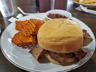 My son is home from college this weekend and I decided to do a barbecue tour stop with him. We arrived at the restaurant around 4:00 on Saturday. This is a sit down restaurant where you are seated by a server and waited on by a waiter or waitress. They have a separate bar area from the restaurant area. The bar area seats about 25-30 people and the restaurant seats around 75 I would guess. They also have a rooftop patio that I did not see. We were greeted and seated immediately upon walking in and our waitress provided great service. There were only about 10-15 other people in the restaurant at this time of day. According to the menu, you can order their sandwiches on bread or on a bun with or without sides. I ordered my standard brisket sandwich with two side dishes. Baked beans and sweet potato fries.